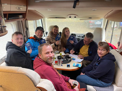 Am darauf folgenden Wochenende ging es dann zum wieder frei gegebenen Auesee. Der Wettergott meinte es nicht besonders gut und schickte schon mal vorab trübes Novemberwetter los. Doch das konnte keinen entmutigen. „Erste Hilfe“ zum Aufwärmen und Kräfte sammeln nach dem ersten Tauchtag gab es mit Tellern voll hervorragend belegter Brötchen, Frikadellen und anderen Leckereien. Vielen Dank dafür nochmal an Marco! Der zweite Tag endete nach Abschluss der Übungen mit der Verleihung der Brevets in Jogys warmen Wohnmobil. Bei Kaffee und Glühwein nahmen Anika, Marcel, Nico und Marco ihre CMAS*-Abschlüsse von den Ausbildern Christian, Didi, Jogy und Andrea entgegen. Und es zeigte sich wieder einmal: Platz ist in der kleinsten Hütte!