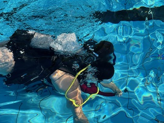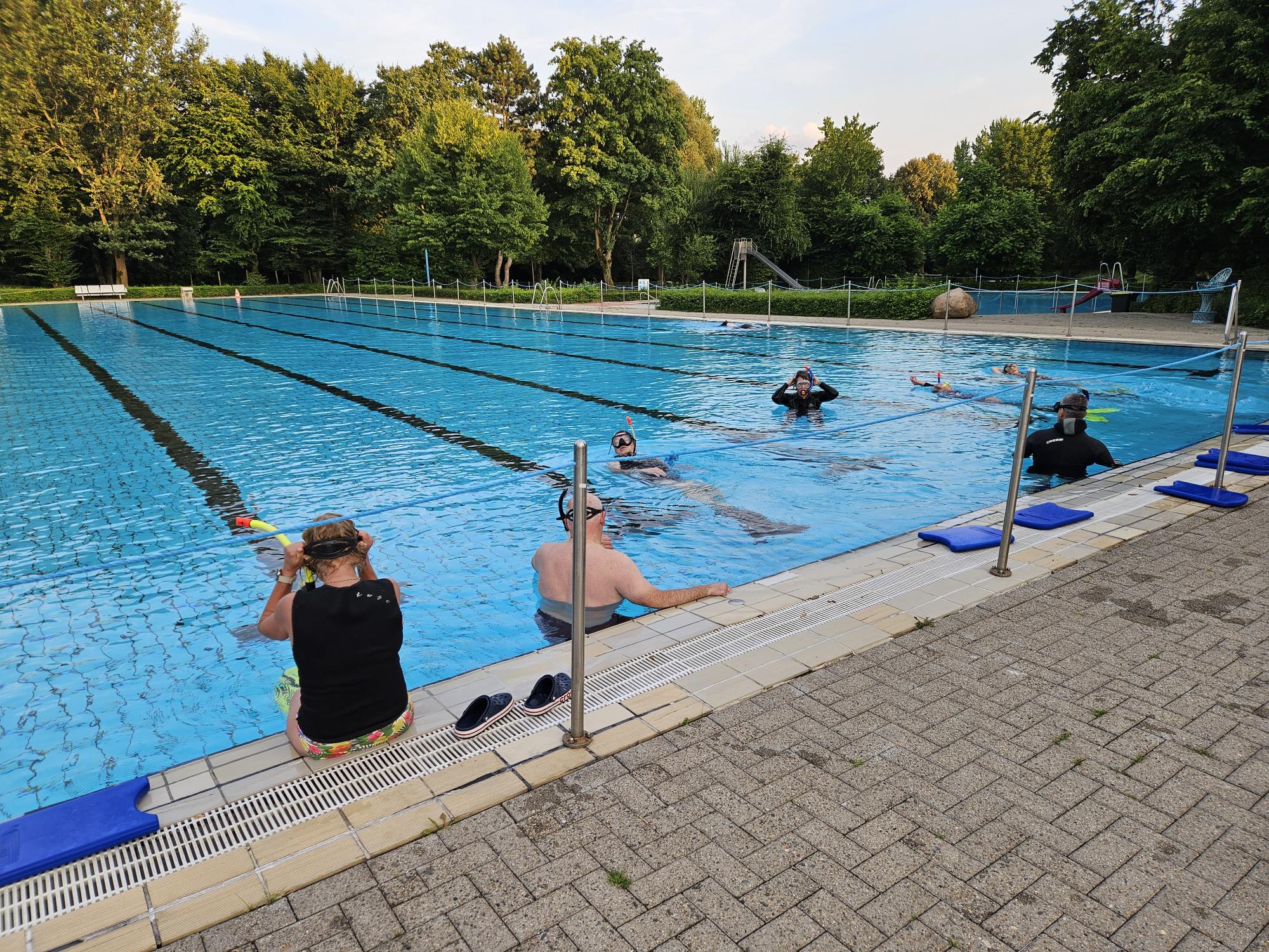 Auch die Orcas waren in diesem Jahr – erstmalig – dabei. Für zwei Montag-Abende von 18.00 – 21.00 h hatten die Taucher bei der Stadt das Angebot zum Schnuppertauchen im Guido-Heiland-Band am Volkspark angemeldet. Also wurde das benötigte Equipment verladen und ins Freibad gebracht. Leider war die Wetterlage am ersten Abend nicht so wie erhofft und die Lust darauf, draußen Sport zu treiben, anscheinend nicht sehr hoch. Zwei unentwegte Freibad-Besucher ließen es sich allerdings dann nicht nehmen, spontan das Atmen unter Wasser auszuprobieren.