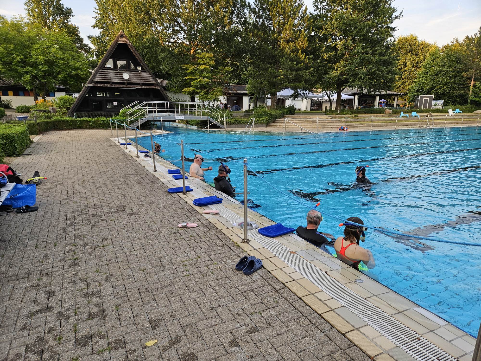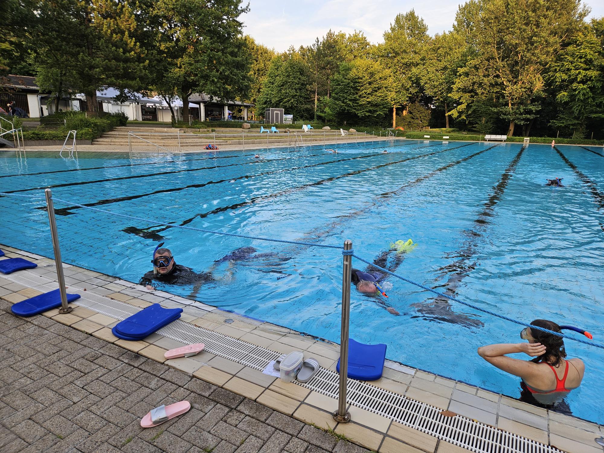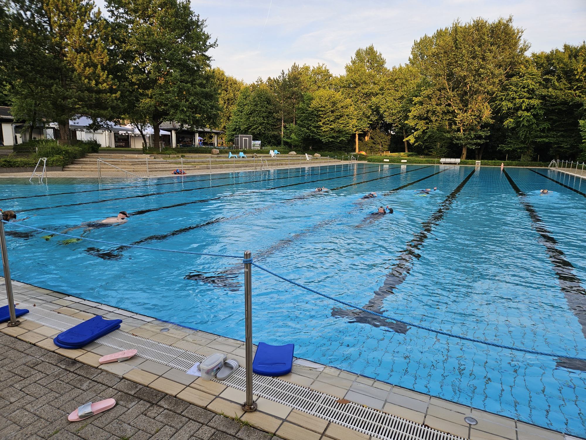 Das Training auf der 50m Bahn hat richtig Spaß gemacht; scheinbar anstrengender als auf 25m...!? Die Lungen mal mit frischer Luft zu füllen war äußerst angenehm. Nach 70 min. ging es dann entspannt unter die heiße Dusche.