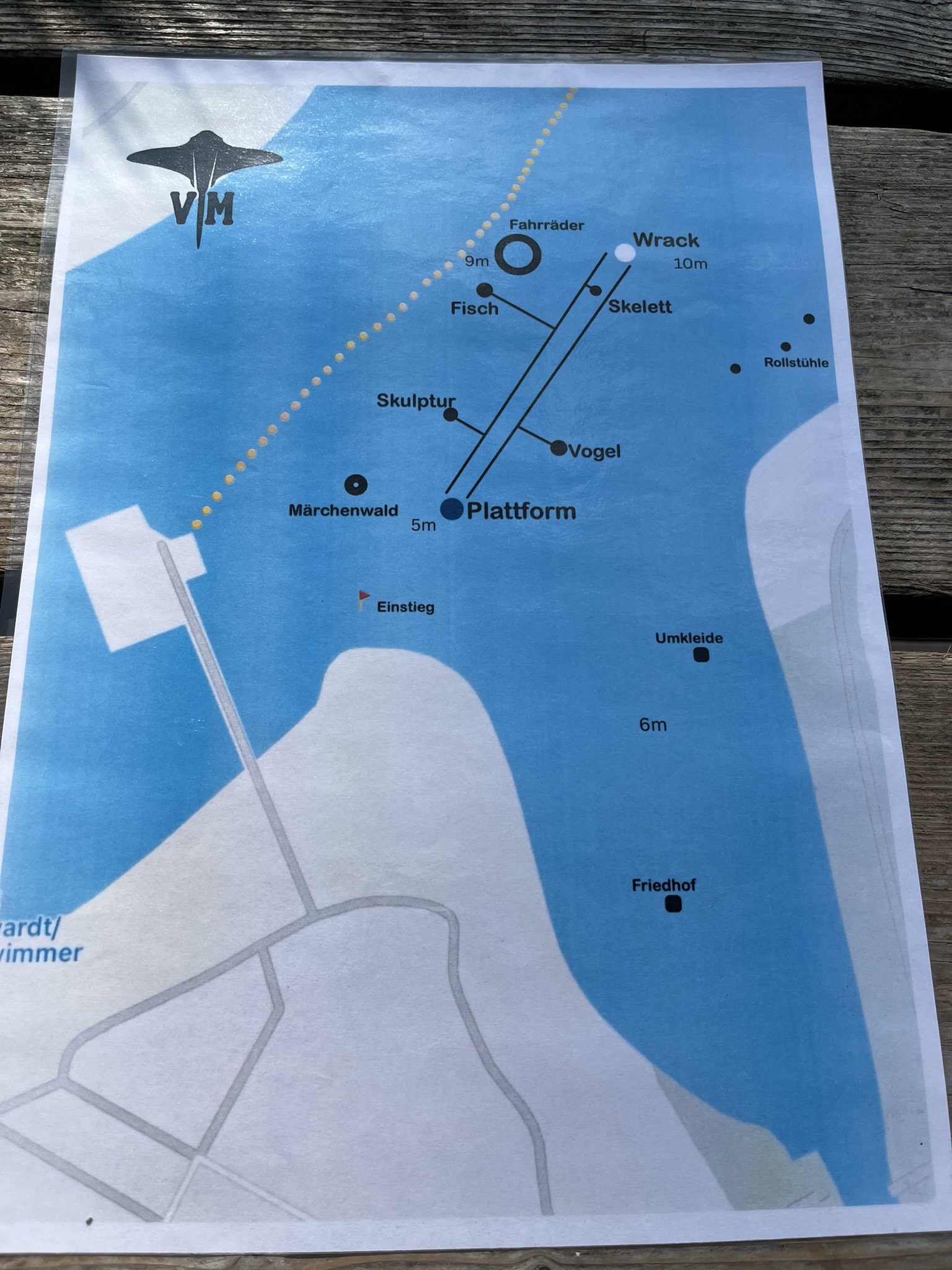 Die Infrastruktur mit Tauchbasis, großer Wiese mit vielen schattigen Plätzen und ausreichend Rödelplatz ist schon besonders in Xanten. Der See selbst bot leider an dem Tag eher schlechte Sichtverhältnisse. Nach einem ausführlichem Briefing durch die Basis machten sich fast alle auf zum Wrack auf ca. 10m Tiefe. Leider war die Sicht durch so schlecht, dass dieses nur erahnt werden konnte. Auf dem Weg dorthin waren aber einige interessante Skulpturen zu bestaunen. Unterhalb des Schwimmbeckens konnten wir aber noch einige Welse und in der Nähe des Ausstiegs auch einen Hecht ausmachen.